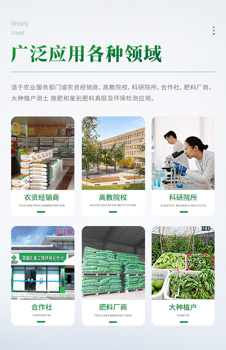 配套齊全:該儀器集藥、器、儀為一體,攜帶方便,相當(dāng)于一個小型移動實驗室,無需用戶自配附件,亦可靈活野外流動測試。適于農(nóng)業(yè)服務(wù)部門或農(nóng)資經(jīng)銷商、高教院校、科研院所、合作社、肥料廠商、大種植戶測土施肥和鑒別肥料真假及環(huán)保檢測應(yīng)用。