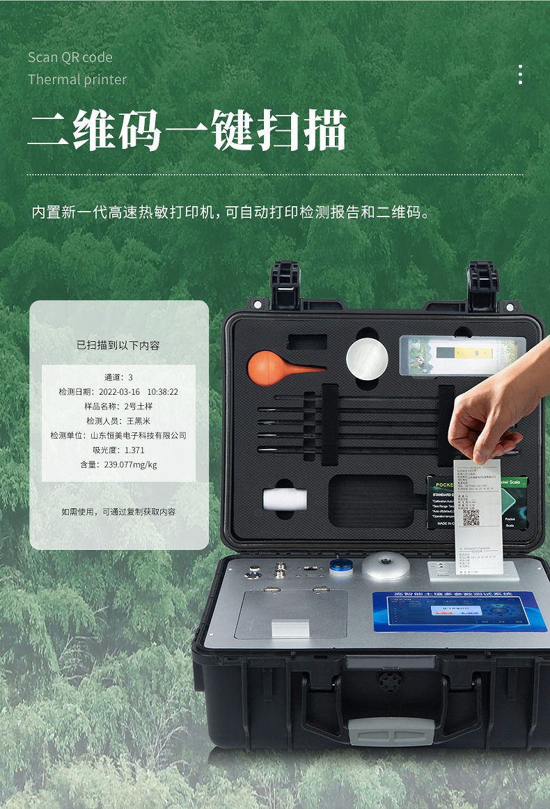 ★21、內(nèi)置新一代高速熱敏打印機(無需色帶),打印內(nèi)容包含:檢測單位、檢測人員、檢測項目、通道號、吸光度、養(yǎng)分含量(mg/kg)、檢測時間、以及二維碼等信息